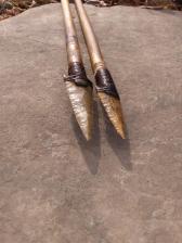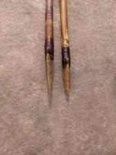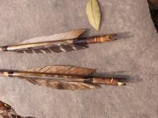 2 Display arrows that would also be great for Boy scouts arrow of light... I crafted these using seasoned river cane shafts, notched in the traditional way,, The points are a Ft Ancient style and hafted into the shaft using epoxy and lashed with real deer sinew. The feathers are real turkey feathers and also lashed with real deer sinew.. The arrows have been given a aged look................ Each arrow measures 29 1/2" overall length. |