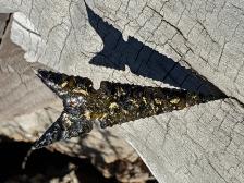 I started by fusing the glass for this point in a special kiln in my microwave with some 22 KT gold in the center. After the blank cooled I was able to flintknap it into this unique arrowhead. It has been signed and dated using a diamond tipped scribe. Enjoy!