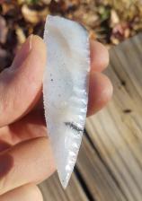 Here are 3 paleo style points that I made out of my old fails. All knappers have a fail bucket that accomadate when things don't go as planned. When dealing with rock that happens quite often but we save them with the intent of reworking them and turning them into something new. The white point(blackskin agate) measures 3 and 1/8th long...the Brazilian measures 3 and 1/8th long, and the fancy jasper measures 3 and a 1/2. Thanks for viewing                       |
