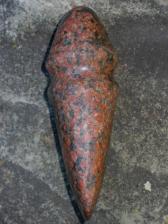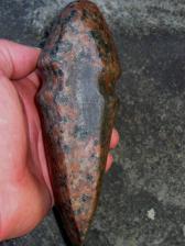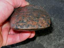 A beautiful 3/4 grooved axe made from speckled granite found in New York. Pecked, finish-ground and polished by hand, this beauty has many hours of work into it. Some peck marks have been left on this piece like you'd see on many of the originals. |