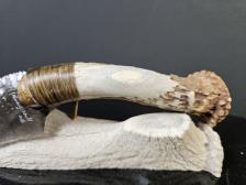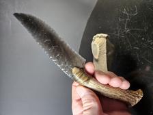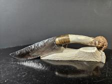 For me it all starts with the blade--SHARP, THIN, FINE FLAKING AND CUTS THICK TANNED LEATHER--that what you get when you have a piece created by artist Kenny Hull. Handmade in the United States, this knife showcases the artist's affinity for ancient design and culture. The use of obsidian and deer antler adds a touch of imagination to the our histories artistry authenticity to this fine, sharp piece. Perfect for collectors or outdoor enthusiasts looking for a distinctive and well-made piece.