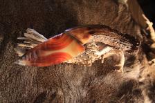 An masive knife. A piece of on fire Piranha Agate carefully matched with mega heavy Whitetail shed. |