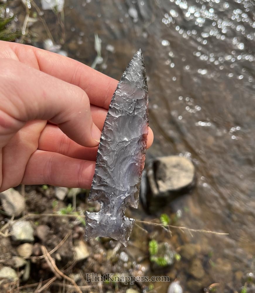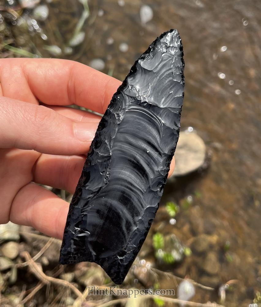 Clovis knapped from Napa black obsidian using all abo tools. Fluted with an antler chest crotch. It has perfectly matched flutes, one of the best Clovis I’ve done. |