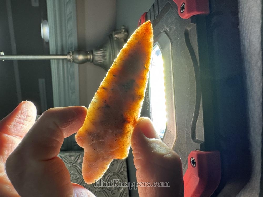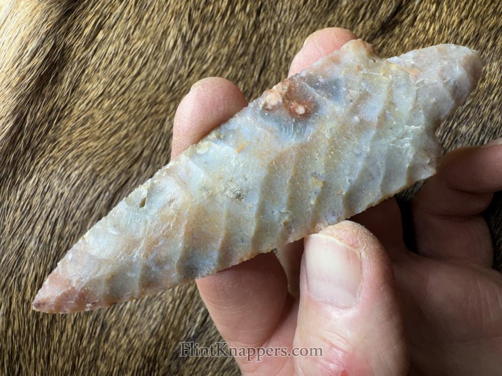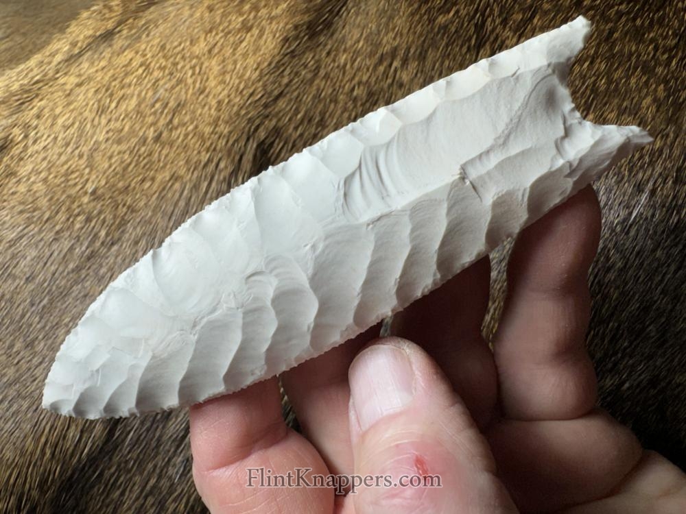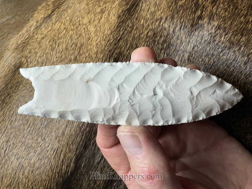 Made from a beautiful piece of Coastal Plains chert from Brier Creek! Serrated sharp with a nice chevron flaking pattern and at least three crystal pockets showing! Thanks for looking! |