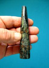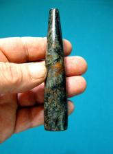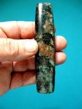 This Adena style tube pipe is carved from GORGEOUS and very unique pipestone. This pipestone comes from the Great Lakes area. It is a hard pipestone that is full of crystalline structures. The colors in it are awesome, with translucent areas as well as sparkle. It is dark black, gray, and a beautiful deep copper, and some bright silver sparkles. It’s really slick and polished to a very high gloss. It’s sure to be a favorite.