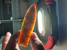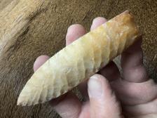Made from beautiful semi translucent Coastal Plains chert from Brier Creek! Nice chevron flaking pattern and a few small crystal seams that show up nicely with a bright light source! Hafting area is ground, serrated sharp, thanks for looking! |