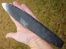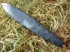 A really nice, large Agate Basin out of black Novaculite, with white tip, knapped by master flint knapper, Jim Redfearn. This beautiful Agate Basin was knapped at the Fairview Heights Knap-in, June 2004. It is attractively signed on the border between the black and white. Signed and dated: Jim REDFEARN 6-6-04 |