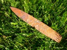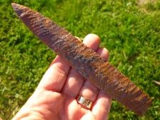 A nice Agate Basin, knapped by master knapper, Steve Behrnes. It’s from a dark yellow and red piece of Texas Techovas, with dark markings. Very colorful. Knapped Apr, 2000. Signed: SB 00 |
