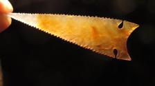 This nice desert Crump lake style point is made from a pretty orange piece of Montana agate with a clear tip. Expanding notches, serrated edges and a very needle tip on this one. Needs a new home...House broken... |