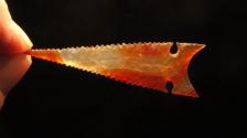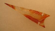 This beautiful little Crump Lake style desert point is made out of gorgeous orange and clear Brazilian agate. It sports a needle tip, expanding notches and serrated edges. I've seen originals that actually look like this one. |