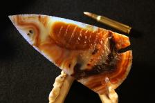 This point has so much going on it is hard to focus on it. Increbible colors full of browns and blacks traveling in dramatic swirling patterns bring this point to life. It is a large, wide point. |