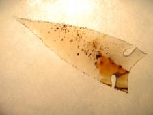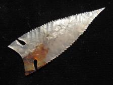 This nice Crump Lake style Northern Side Notch point is made from a colorful piece of Montana agate that is mostly clear with black freckles, streaks, and a splash of orange near the bottom end. Finely flaked and serrated with expanding notches and a needle like tip like the old ones had from the Warner Valley region of SE Oregon. |