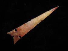 Very nice agate SW style point with needle tip and fine serrations. This is made from an Oregon agate I think. It has a dark spot in the material along the edge just past the half way point to the tip which has a purple colored tinge to it. |