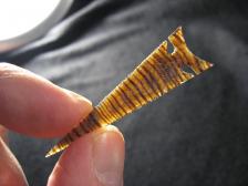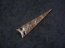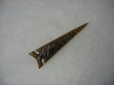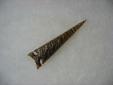 Extra fine little Wintu arrowhead made from banded agate wood material. This material comes from Montana just outside of Yellowstone Park. Really nice dark wood bands in this one. There is also some finer wood rings running the length of the point that don't show in the pic as well. Killer little point! |