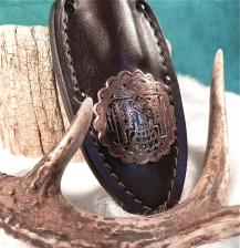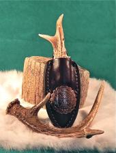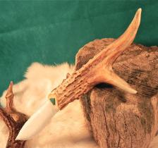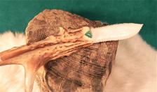 I call this knife “The Albino.” (It has light color tones throughout).The beautifully knapped blade is white milkglass – antique carrara from the 1940’s. The grip is a deer antler tine that is knobby & has been flamed for a little character. Onlaid to each side is a cabochon of turquoise. This knife fits & holds really nice. The leather sheath is a great fit & displays a thunderbird medallion. Knife is 8” long. As usual…all is buffed & polished to perfection. (I will need $9.00 for shipping & insurance). **NOTICE: WHILE SHARP & BUILT TO LAST….MY CREATIONS ARE FOR COLLECTING PURPOSES & NOT FOR HARD USE! |