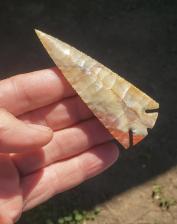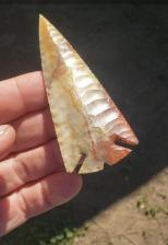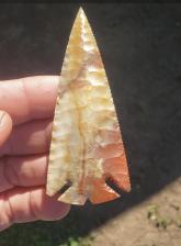 Here is a super nice Elko point made from Alibates from Texas. Great flaking and super thin edgework. Thanks for viewing |