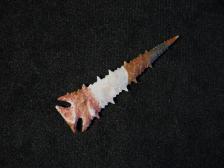 Here's serrated Scallorn point made from Texas Alibates flint. Some of the originals were wildly serrated like this one is. Nice colorful piece of hard to find Alibates. |