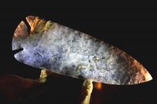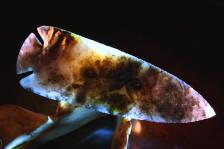 This is a big spear point, which was knapped from blue ice with dendrites amethyst sage. It is a large blade making it a very impressive spear for anyone's collection. This one has it all, multiple colors, dendrites, glassy material, and very refined,sharp edge work. The photos do not do this point justice. It is an impressive point with lots of moss and purples. A nice addition to any showcase. |