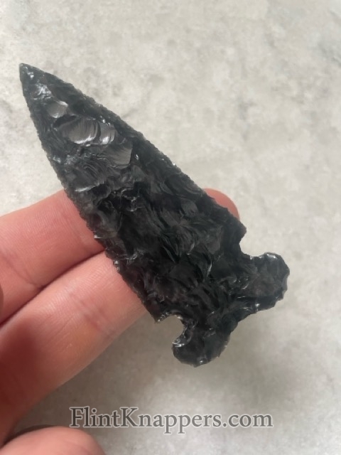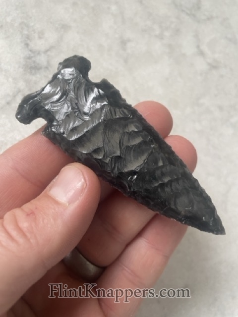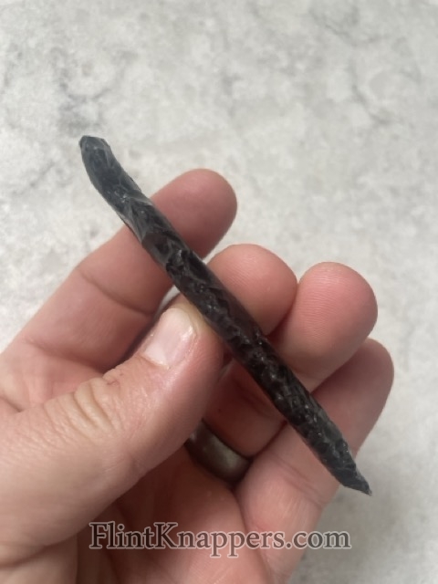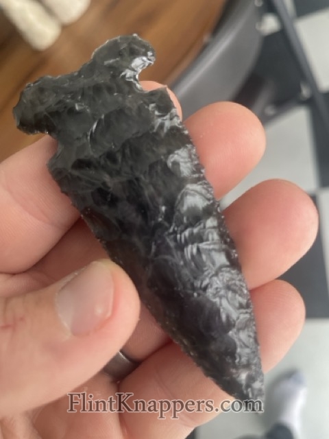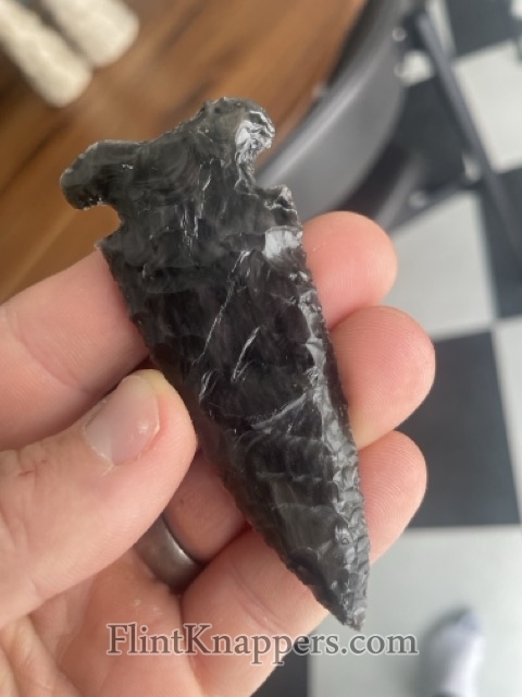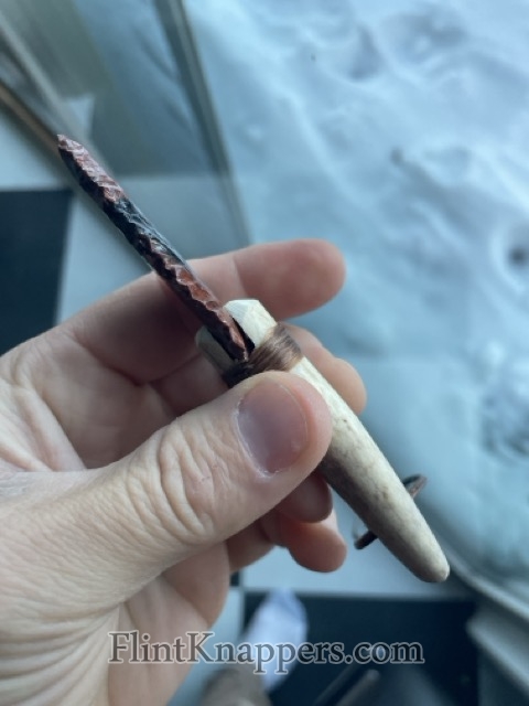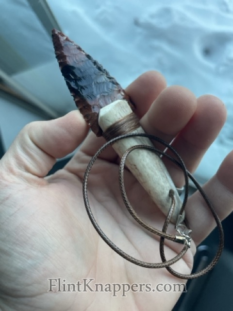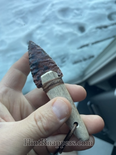 A mahogany blade set in a small antler tine tip. Blade is hafted. Artificial sinew wrapped around the base. Would be a neat gift for a young kid / outdoorsy person!