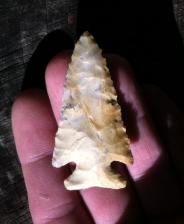 Raw Flintridge from across from the park. This peice is a few shades of Tan,translucent Grey and Green. Chipped from a small plate with antler tine notched with Buffalo rib bone. Blade is serrated and base and notches are ground.