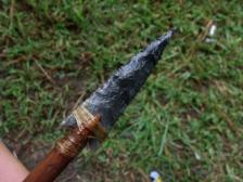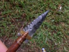 Garza point, novaculite hafted into a stained oak shaft with whitetail sinew and animal hide glue |