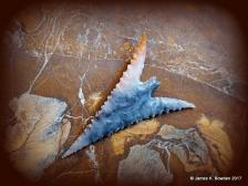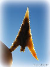 Ohio Flint Ridge is a wonderful material!  This piece has a lot of the great colors that FR is known for (gray-blue, orange, and white), and displays a bit of translucency when back lit.   It has the delicate flaking and needle like tips that is characteristic of James Bowden's flintknapped lithic art.  If you love gem points, then you'll love this Columbia Plateau arrowhead!