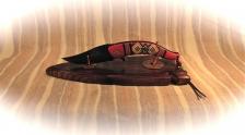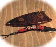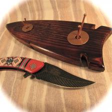Coming to you here is a new factory manufactured knife – from the “Master Collection - Ballistic” series, in a red themed Southwestern handle pattern – of nylon fiber. The flipper-folder blade is a gorgeous “feather pattern” Damascus-look, blackwash color. (Framelock & spring assisted). I’ve built an “arrowhead” display stand out of wormy American Chestnut wood. I’ve flamed it for character dressed it up in copper-toned props. A nice combo & such a neat Southwestern knife! Knife (opened) is 8 ½” long. Please add $9.00 for shipping & insurance to anywhere in the US. Thanx for looking! |