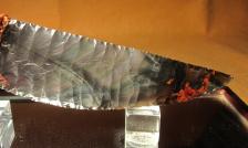 Amazing shimmering aurora borealis from Davis Creek, CA hafted into highly figured iridescent Sapele hardwood from Africa. Colors much better than in photo.