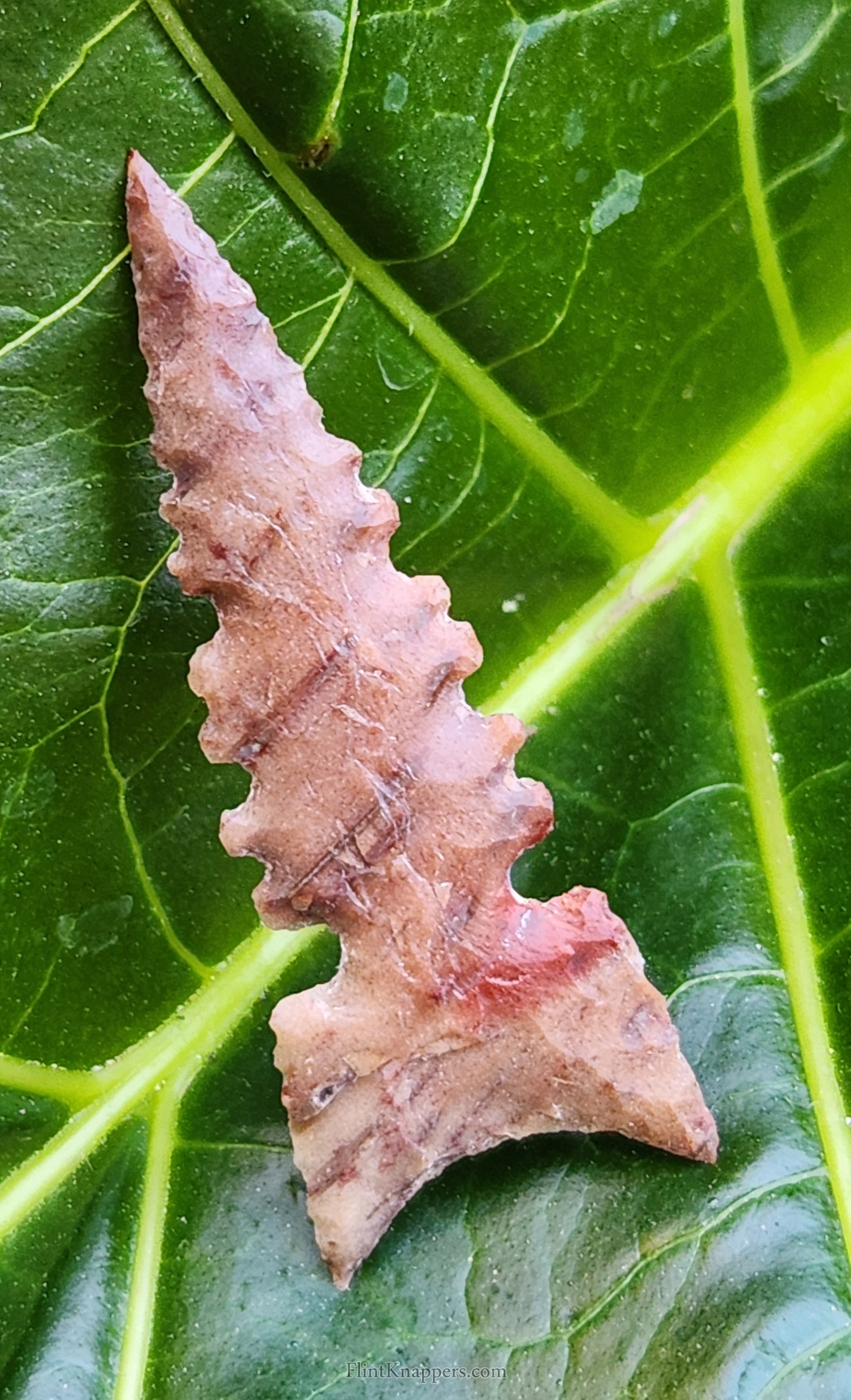This jasper has a unique look with it's defined banding of colors. The long outswept ears, fine serrations, and very fine tip also really adds to its overall beauty. It has been signed and dated with a diamond tipped scribe. Enjoy!!!