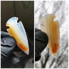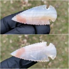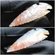 Bifaced with direct percussion using solid copper round, pre-formed with indirect percussion, pressure to finish.