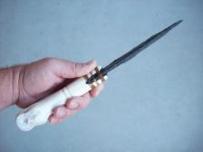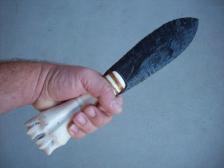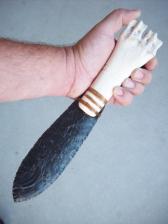 larger than the other, this knife is made from a highly polished elk leg bone and dacite blade hafted with PPG and sinew. |