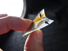 Real pretty banded agate Wintu styled point. Amber with blue/grey pattern in clear agate. Thin and sharp. |