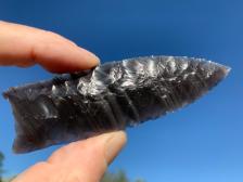 Light shines through the grey banding on this blade. It was made by percussion and pressure, yielding a straight edge and fine tip. |