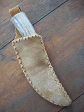 banded obsidian blade, whitetail antler handle, hafted with PPG and stained rawhide. the sheath is smoke tanned deerskin. |
