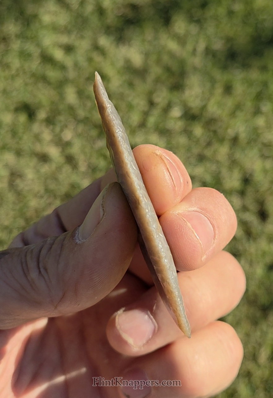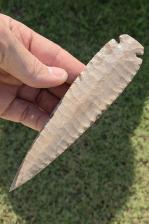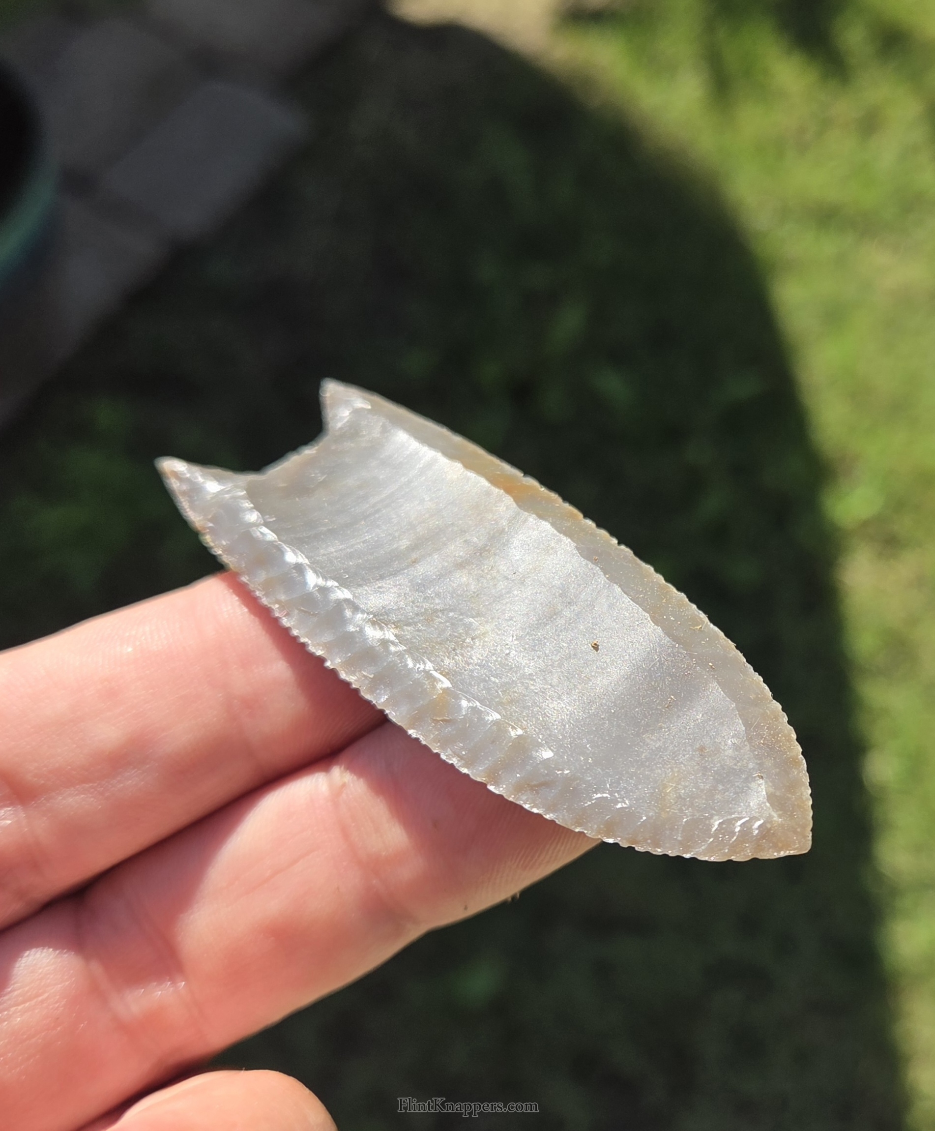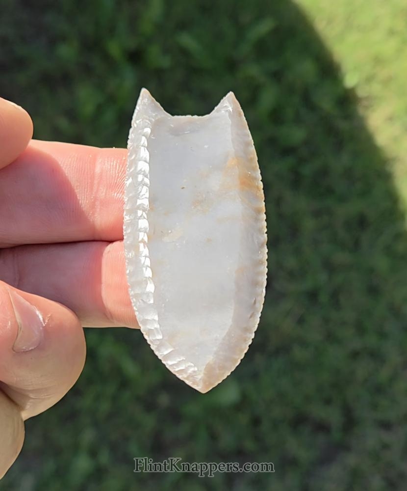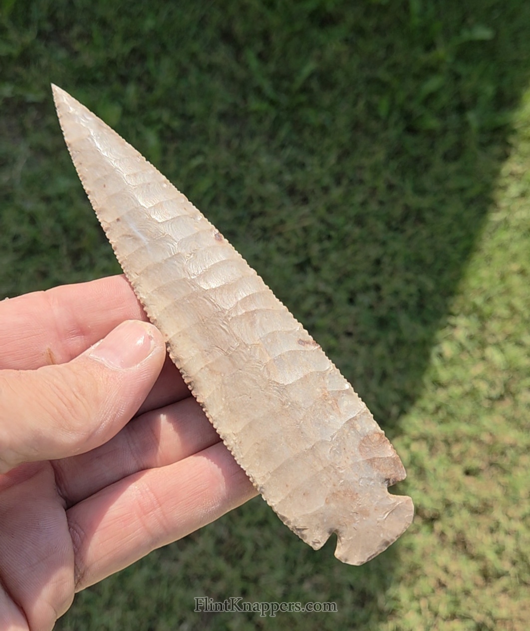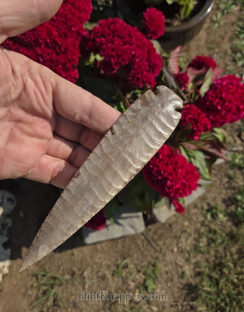 A beautiful clovis point made out of Texas banded Rootbeer. Super thin edges and built to be functional if one desired to use it. |