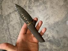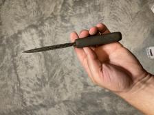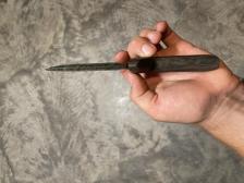 8 inches overall banded slate handle carved by Kane Vinson and burns green obsidian blade made by Doug Shelton |