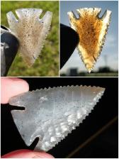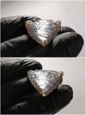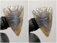 Nice Base Notch Point in a excellent piece of Indian Moss Agate. Good flaking, smooth and regular surface, nice serrations and well balanced. This piece of Indian moss has banding that roughly mirrors the shape of the point with lots of awesome Dendrites inside. High luster and awesome light refraction as well. There is a healed crack near the edge with some Dendrites formed between as well. Rest assured, it is completely healed. Nice piece of agate here.