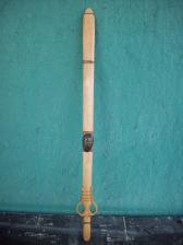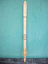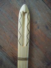 the iconic spear thrower of the American Southwest, the Basketmaker II (named for the culture that used it) is one of most refined and unique atlatl systems there is. its one of a kind grip (called the 'floating' grip) and delivery are unlike anything else in the world and, after some getting used to, produces one of the fastest and flattest trajectories around. this recreation is made from a solid branch of super tough, yet flexible, carob with a carved integral spur and burned in designs. the finger loops are smoke tanned deer hide with quilted stitching and are fully adjustable, and the the weight is a polished cobble of speckled granite placed for maximum balance. 25'' overall. come try this classic design. order between now and April 29th with two matching darts and recieve a third dart free! |