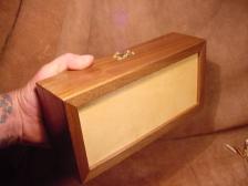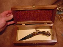 Offered here is another beautoful jewely bob made from black walnut and exotic burl....so with the black theme I carved a bear track handle on a genuine elk crown and attached it to the lid, this is a perfect box for anything including antler carvings or a stone knife. signed bonecarver and numbered. FREE SHIPPING |
