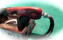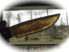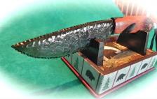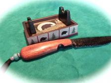 Nicely knapped antique carrara glass blade anchors this collectors knife & stand. It looks black until a bright light is held behind…then it takes on a dusty olive color (a very scare color for this old glass). The handle is hard mahogany wood, with a bear paw motif that I carved & flamed into the side (sorry the picture is a little too dark). Carved finger notch & well thought-out handle design, make this & all my knives very comfortable to hold. Silver & turquoise beads on a soft leather lanyard round out the piece. The knife is 9 ¾” long, & is tightly glued together & well balanced to hold. All is hand rubbed to a nice luster. The “bear” stand IS included. As always, the knife come to you wrapped in a flannel cloth. |
