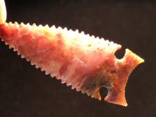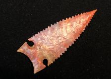 This desert style Northern Side notch point is made out of a really gorgeous piece of agate with color and transparent hues all over in it. There is a lot more color in this material than the photo shows. I'm not certain where the rock is from but might be out of central l Oregon. Wish I had a couple tons of this stuff. The pics don't do it justice. I made a Crump Lake serrated side notch style out of it. |