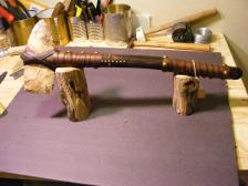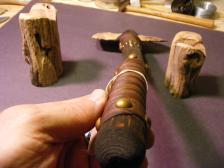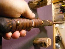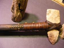 Here is the last Tomahawk I am putting up, this one has a Burlington Blade hafted to a hand carved piece of poplar wood using wet rawhide which shrinks and tightens as it dries... The piece was wrapped with leather and brass tacks added for decoration and the whole piece was slightly aged to look old.... Comes with the wood stands and Free priority shipping and Insurance which would cost you around $22 |