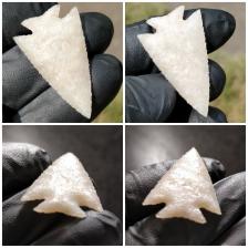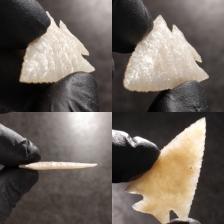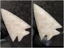 Nicely flaked and edged Bird Point in self collected Minnesota Chalcedony. This particular Chalcedony is very reminiscent of Agatized coral, but has the color of Ivory or cleaned bone. Spotted with tons of tiny druzy veins and pockets, which are difficult to see in the pics but will sparkle in the light.