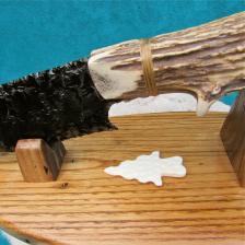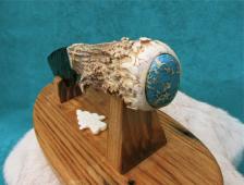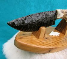 A handsome flintknapped knife & stand. The eye catcher here is the awesome glass blade. Nicely knapped & made from antique, vitrified structural glass. The thing appears as black as obsidian, but when held to a bright light, shows amethyst around the edge! A nice Gnarly piece of Elk antler makes the handle. (with a small brow tine tip for added grip). I’ve hafted this one a little different, sporting a sinew wrap in a rear slot. The butt of the handle is dressed-up with a large blue “sea sediment” stone cabochon – that I have inlaid into the bone. I fashioned the stand from a small stash I have of American wormy chestnut wood. A stylized carved bone arrowhead rounds out the combo. Nice warm colors & an earthy look! Doesn’t look like it in the pictures, but the stag is polished nice & smooth all over ! Would make a great gift for someone special….The knife is 10 ½” long, & I will need an additional $12.00 to ship & insure the piece anywhere in the U.S. **NOTICE: WHILE SHARP & BUILT TO LAST….MY CREATIONS ARE FOR COLLECTING PURPOSES & NOT FOR HARD USE! |