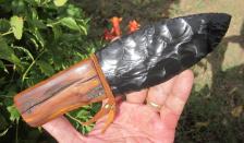 Pure black butter obsidian from OR hafted into primo osage from Kansas and finished with deer hide and brass beads. Great rustic looking knife.