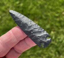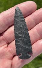 A very well made dovetail point, made from black novaculite material. Has really nice flaking. |