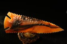 This is a very rare piece of material. The point is knapped from a piece of Indian Black Skin Agate. It is hard to fined pieces this large. It is another serrated pinetree from the "Points of No Return" series, featuring the reverved cat claw serrations. This point is from my personal collection. |