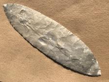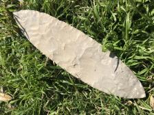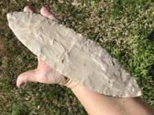 A nice 10-inch blade knapped, evidently, from a huge chunk of Fort Hood flint. It was knapped by talented flint knapper, Roy Harris, at the Cajun Knap-in, April, 1998. The color is light brown with some white and gray spots. He told me the material was Copperas Cove. We purchased 2 blades from Roy at the knap-in. Knapped April, 1998. Inv # 9804-30R |