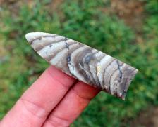 A sweet Goshen style point made from some of the more uncommon blond Tiger Chert, point even has some blue chalcedony spots in it.