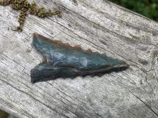 Outstanding serrated Dalton arrowhead made out of the rare blue green flint ridge material. |